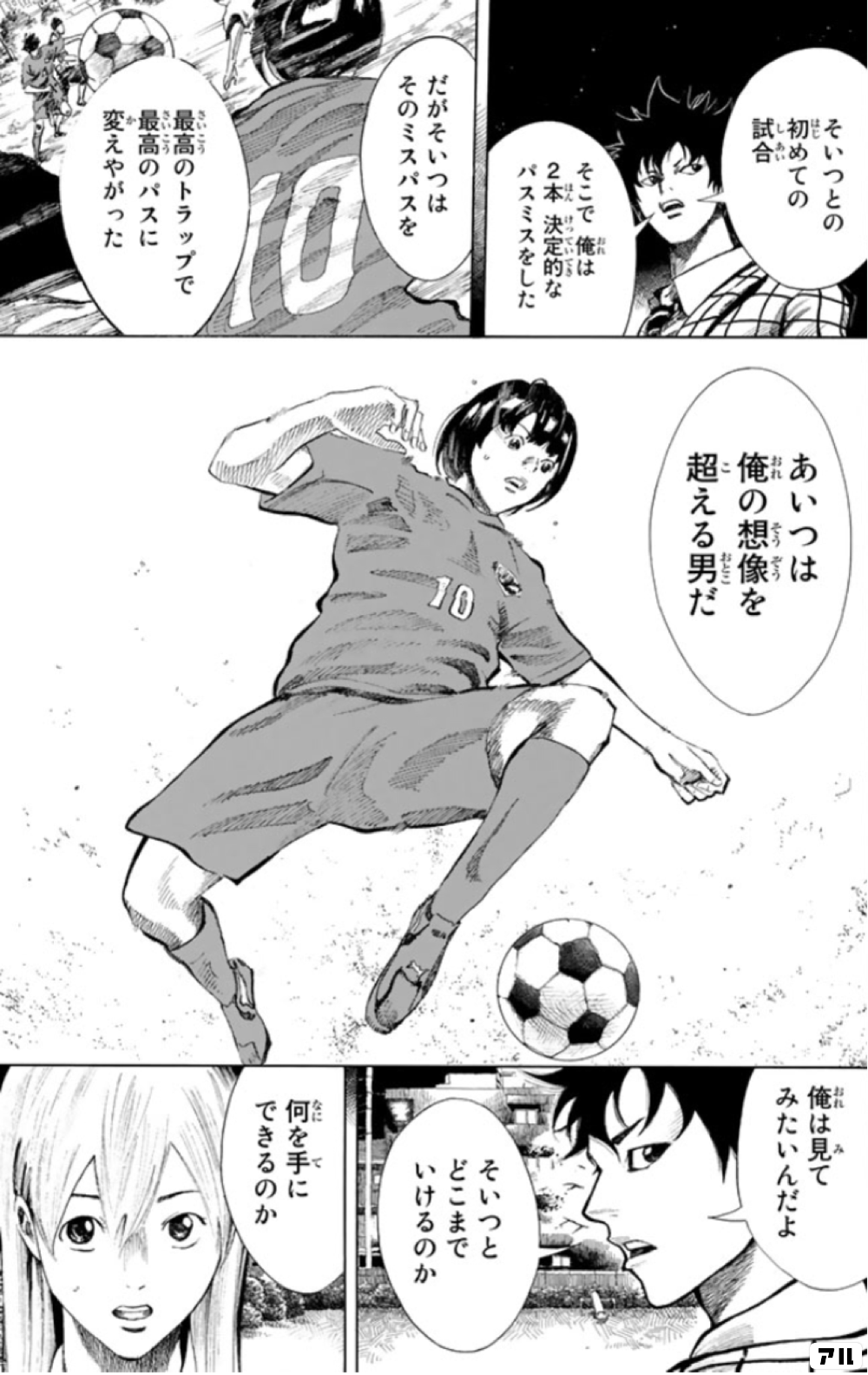 そいつとの初めての試合 そこで俺は2本決定的なパスミスをした だかそいつはそのミスパスを 最高のトラップで最高のパスに変えやがった あいつは俺の想像を超える男だ 俺は見てみたいんだよ そいつとどこまでいけるのか 何を手にできるのか 振り向くな君は アル